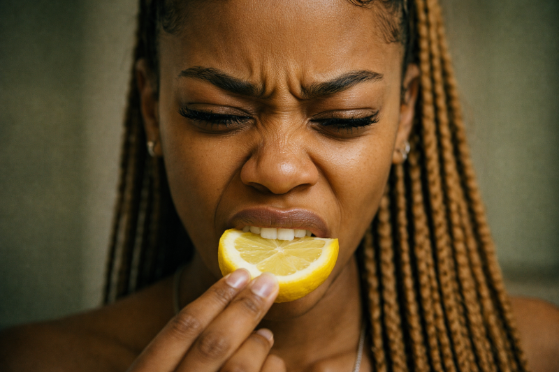 Stell dir kurz vor: Du beißt in eine eiskalte, saure Zitronenscheibe. Gelbe Schale. Saft. Zack – sauer.